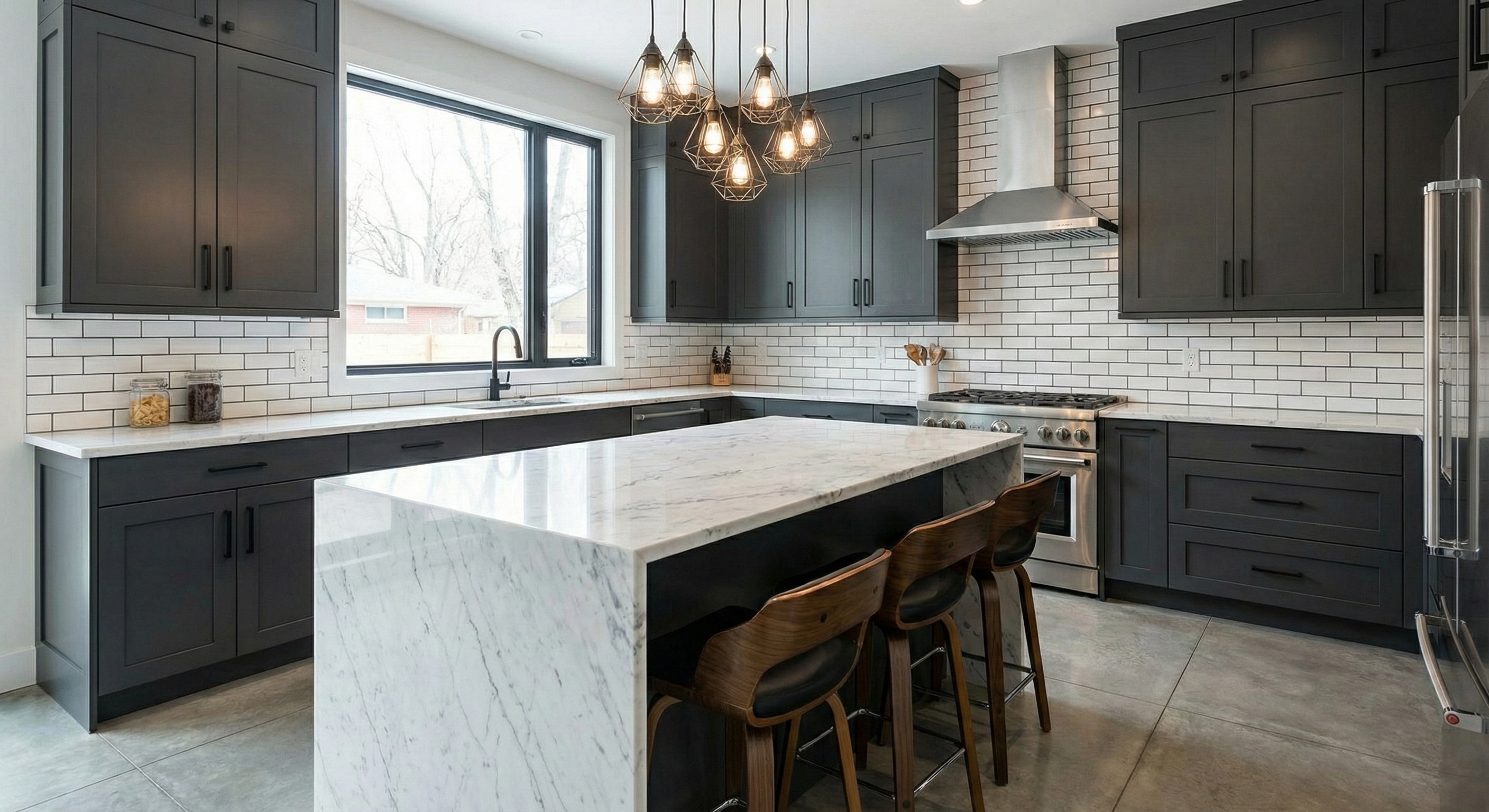 For kitchen islands, we can create dramatic waterfall edges where the countertop material continues down the sides. This requires precise mitering and color matching to create seamless corners.